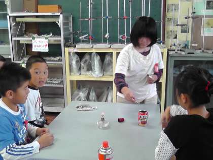 理科室で学習をしました。まず,理科室にはどんな物があるのか見ました。フラスコやビーカー,試験管など普段見慣れないものがたくさんあります。
