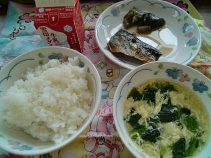 今日の給食は,ごはん・牛乳・にしんなす・かきたま汁でした。