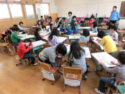 図工では、生活科で育てたチューリップを画用紙いっぱいにクロッキーしました。