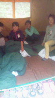 シュラフの準備もてきぱきとこなし,笑顔いっぱい