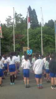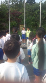 すがすがしい空気の中,朝の集いをしました。