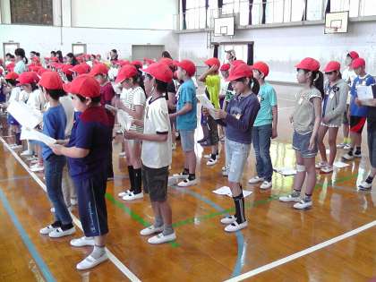 休み時間に体育館に集まり,色ごとに応援練習をしています。