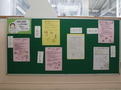 保健室では救護係の5・6年生児童が各教室で掲示するポスターを作成し,配布しました。ポスターはそれぞれが工夫を凝らし,運動会でみんなが安全に気をつけて元気に活動できるために,水分補給や生活習慣,身だしなみのポイントについてまとめてかいています。保健室前廊下にも掲示していますので,来校されました際には,ぜひご覧ください。