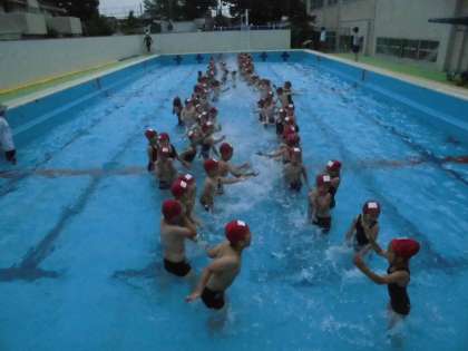 水遊びが始まりました。はじめは、プールのきまりを知り、安全に学習ができるように子どもたちと確認をしました。