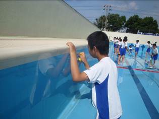 去年から新しいプールになり,まだまだきれいなプールですが,それでもひと冬を越すと壁面にも床にも汚れがたまっていました。そこで,スポンジで一生懸命壁や床を磨いてくれていました。