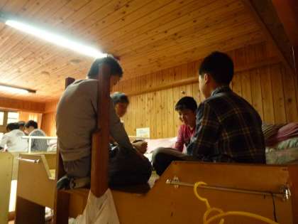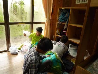 活動と活動の間には,フリータイムがあります。この時間は,ただ自由に過ごすのではなく,自分の持ち物の整理整頓や次の活動の準備をしてから,部屋で友達とゆっくり過ごしたり,各部屋のミーティングルームでキャンプファイヤーの出し物の練習をしたりしています。