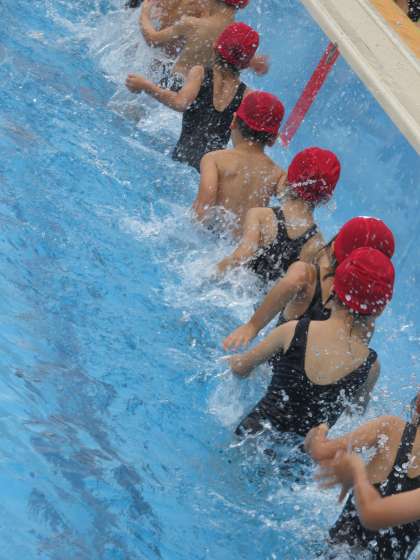 水遊びが始まり、子どもたちの笑顔もいっぱいです。1年生は、水中で目を開けられるようになることを目標にしています。水の中でじゃんけんをしたり、だるま浮きをしたり、おもいきり水の中に飛び込んだり、遊びを通して学習を深めます。