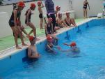 「ひまわりプール」の時間には9人が一緒に1年生の水位に合わせた深さのプールでお互いに水のかけ合いや,25mの競走(泳)を楽しんでいます。高学年の人の「ふしうき」や「けのび」「バタ足」のお手本を見て1年生も練習をしています。