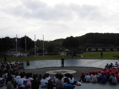 9月17日(土)定刻の午前7時より少し早い午前6時50分より, 他校と合同で朝の集いをしました。全員が, 「5分前行動」を超える「10分前行動」ができたので, 早い目の今日のスタートです。それぞれの学校が, 順番に学校紹介をしました。本校は, 児童会目標や音楽集会, 地域の方々から見守り隊や放課後学び教室などで支えていただいていること, 9月10日に参加した地域の福祉大会のことなどを紹介しました。しっかりと, 西京極小学校のよさを伝えることができました。