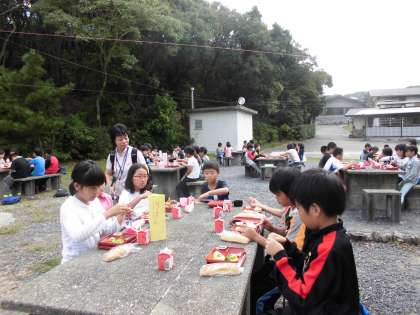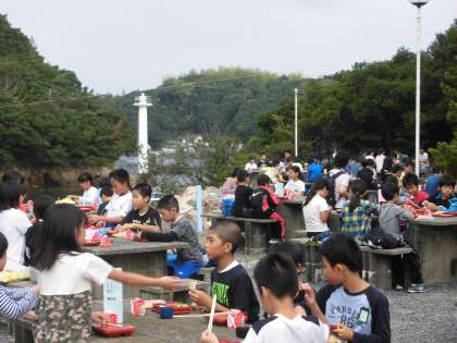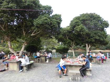 少し曇り空ですが, 涼しい風が吹いています。今朝は, 野外炊事上の屋外テーブルで朝食をいただきました。潮風を感じ, 時折, すぐ横を流れる深谷水道を通り過ぎる漁船のエンジンの音を聞きながら, さわやかな時間を過ごしました。