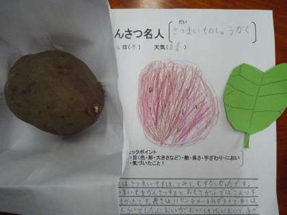 春に植えたさつまいもの収穫をしました。さつまいもを傷つけないように,手でそおっと土を掘りました。残念ながら収穫できたさつまいもは少なかったのですが,子どもたちは大事そうにそのさつまいもを持ち,観察していました。