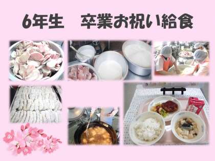 本日は6年生卒業お祝いの献立でした。一枚ずつ心をこめてトンカツを調理員さんがつくってくれました。6年間で約1180回の給食を食べてきた6年生です。6年間で心も体も大きく成長しました。中学生になっても食べることを大切にしてくださいね。