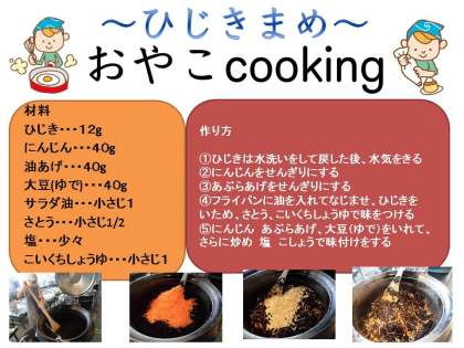 給食がはじまって約1週間がたちました。子ども達は毎日もぐもぐと美味しそうに給食を食べています。子ども達に人気である、じゃがいものクリームシチューやスパゲティのミートソース煮!!残食ゼロでした。子ども達に人気なのは洋食が多く、もっと和食のよさを子ども達に知ってもらい進んで食べてほしいと願っています。そこでお家でも手軽に作れるひじきの煮つけの作り方を紹介します。お子様と一緒につくってみてください。