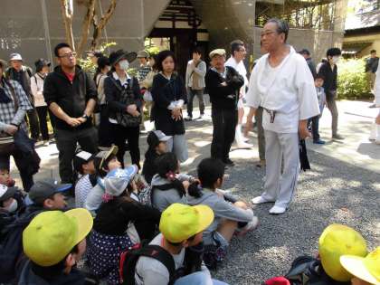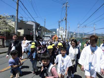 4月23日(日)地域の祭り「松尾祭(神幸祭)」がありました。松尾祭は昔から西京極のまちに伝わる伝統行事のひとつで, 神輿が船に乗って桂川を渡ることで有名な祭です。本校からは希望者として11名の児童が参加しました。途中で西京極西小学校の児童と合流し, 一緒に祭に参加しました。はじめに, 松尾大社で地域の方から西京極地域の昔の話や松尾祭のお話を聞かせていただいた後, 実際に神輿を引っ張りました。さわやかな青空の下, 地域の人々と一緒に伝統ある地域行事に参加できた貴重なひとときでした。これからも, 地域の素晴らしさにふれ, 西京極のまちを愛する子どもに育ってほしいと願っています。