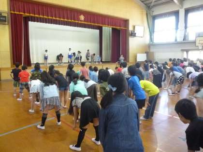 運動会に向けて,今日は準備運動の練習がありました。体育館で5・6年生の係の人がしっかりと見本をみせてくれました。
