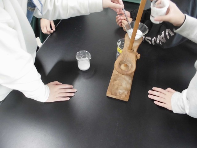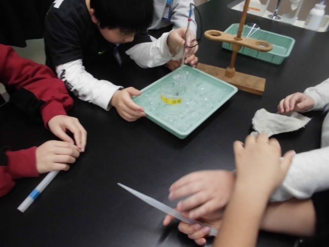 「水の温度を下げるととけたものはどうなるのだろうか。」という学習問題を解決するために実験をしました。ポイントに気をつけて水溶液を濾過し、氷水で冷やしました。思うような結果が出ないところもありましたが、そこから考察することで、さらに深い学びをすることができました。