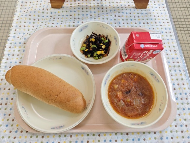 今日は年に1度の「ビーフシチュー」です。普段の給食には国内産の肉を使っていますが、年に1度このビーフシチューにはオージービーフ(オーストラリア産の牛肉)を使用しています。これは国内産の牛肉が何かしらの理由で使えなくなった時に緊急的に外国産の肉を使用できるようにしておくためです。じっくり煮込んだ角切り肉はほろりとした食感となり、子どもたちも「お肉おいしい!!」と喜んでいました。