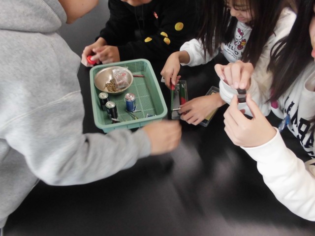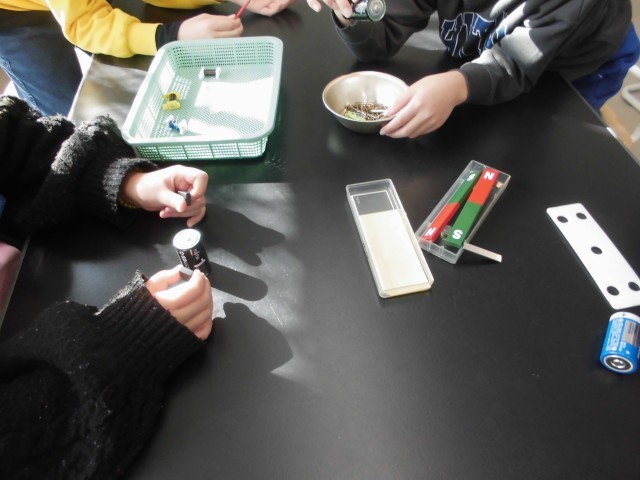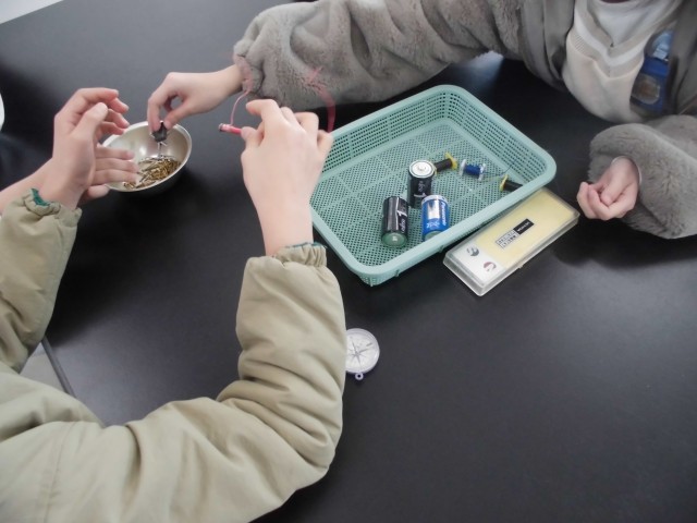 電流と磁石については学習している子ども達。「電磁石」という文字から「電気を流したら磁石になるもの」と予想し、道具を触りながら確かめることができました。今後、学習問題を立て、実験を通して解決していきます。