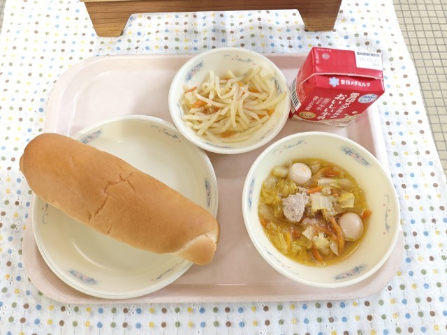 今日は年に1度の「肉団子のスープ煮」です。肉団子は1つ1つ調理員さんが手作業で作っています。手作りの肉団子はふんわりとした食感で、ほのかに香るしょうがの香りが豚肉のうま味を引立ててくれています。子どもたちも「ハンバーグみたいな味がする」「やわらかくておいしい!」とおいしそうに食べていました。
