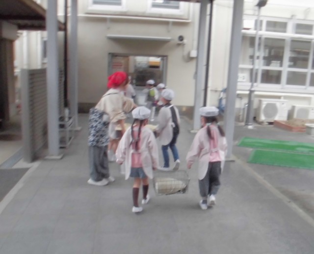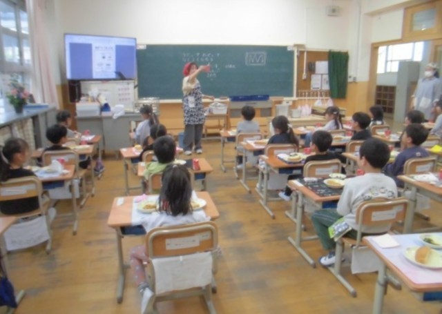 先生と一緒に自分たちで食器やおかずを教室まで運び、パンやおかずを机にきちんと並べました。給食の時間の過ごし方について、先生のお話をしっかりと聞いてから食べていました。