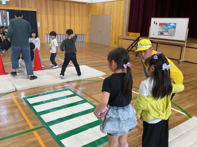 安全な登下校の仕方について教えていただきました。体育館に作った道を実際に歩く練習も行い、