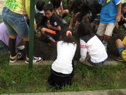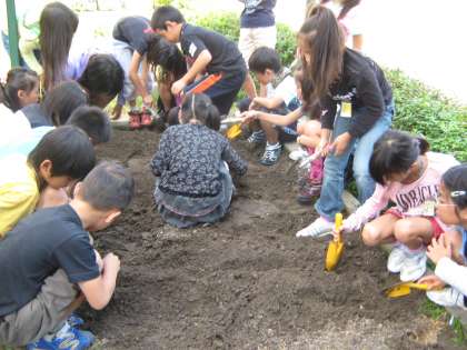 学年の畑に大根を植えることにしました。先週末に肥料をすきこんだ畑の土を盛って,今日は子どもたちの手で畝作りをしました。