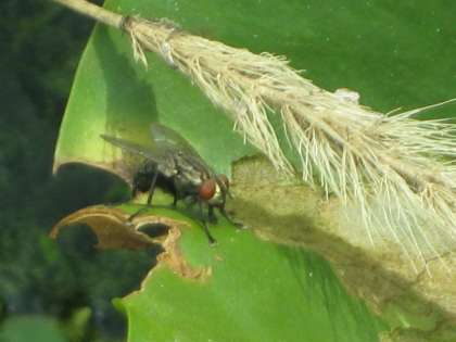 観察池で、センチニクバエを見つけました。どこにでもいるニクバエでよく見かけると思います。名前の通り、動物の死がいなどにたかります。幼虫もそれを食べて育ちます。