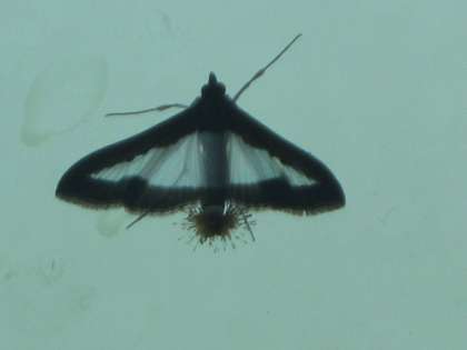 校舎の3階で、ワタヘリクロノメイガを見つけました。メイガというガの仲間です。はねのまわりが黒く、中央は白色の半透明です。オスは腹部の先端に、鱗毛束という花ににたような毛の束があり、それをグルグルと回す習性があります。なんだかとても気味悪い動きをしますよ。見つけたらちょっとつついて見て下さい。おもしろいですよ。