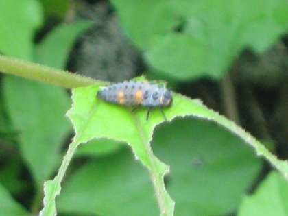 観察池の前で、ナナホシテントウの幼虫を見つけました。植物の養分を吸ってしまうアブラムシを食べてくれる益虫です。成虫になってからも、アブラムシがえさです。幼虫のうちは、アブラムシの数が少なくなるとよく共食いをします。