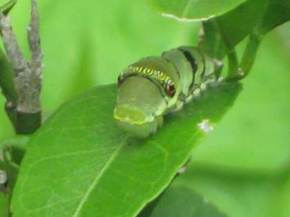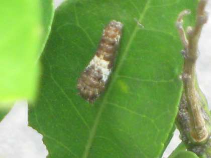 学級園のミカンの木で、アゲハの幼虫を見つけました。写真は、上が4令幼虫で下が5令幼虫です。4令幼虫の方は、何か他の物にみえませんか?そうです、鳥のフンに見えますよね。上手に鳥のフンに擬態しています。5令幼虫になると、鮮やかな緑色になります。