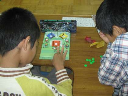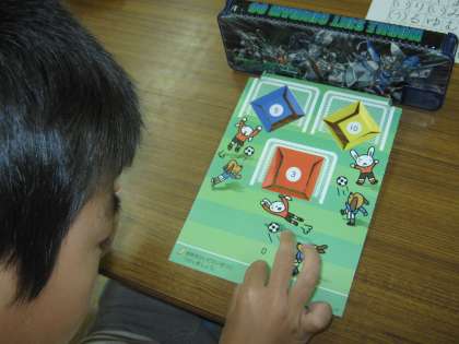 中間休みに、2人でサッカーゲームをしました。紙で作ったサッカー場に、おはじきを指ではじいてゴールします。入ったゴールに応じて得点がもらえます。5点のゴールに3個だと、5×3=15というふうにかけ算の勉強もかねています。また一緒に遊びたいです。