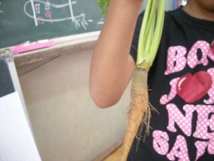 うさぎの事を調べる以外に,うさぎの世話も頑張ってしている1年生です。班ごとにうさぎに名前を付けています。だっこしたり,食べ物をあげたりもしています。うさぎのために育てた人参も小さいけれど出来ています。うさぎに自分の育てた人参をあげてとってもうれしい気持ちになった1年生です。