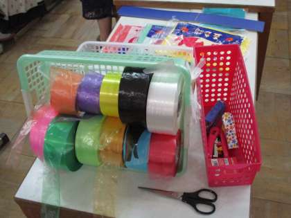 先日,校内で図工の研究授業を行いました。2年生の「わっかで飾って大へんしん」という題材です。まず,頭にかぶる輪っかをつくり,かぶりながらもっと楽しくなるように考えて表しました。今回の材料は紙類と梱包用テープです。薄紙を手に取って担任に「これも紙?」と不思議そうに尋ねていた子は,その紙を吹いて揺れることを楽しみながらイメージした形に切っていました。表したいイメージに合うように形や色を考え,実際に材料に働きかけて作品をつくっていく過程で,子供たちは様々に思考力・判断力・表現力を発揮し高めていきます。つい大人は,出来上がった作品に目が行きがちですが,実は子供にとっては活動の過程が大きな学びであり楽しさなのです。研修では子どもの活動での行為や友達とのかかわり,つぶやきなどから子供たちがどのような学びをしているのかを読み取り評価について検討しました。子供たちの学ぶ主体性を大切にしつつ授業の1時間で何をどのように学べるかを考えるのはどの教科も共通しています。西京極西小の子供たちに,楽しい生活をつくりだす生きる力をしっかり育んでいくために,教職員チームとしてこのような研修を積み重ね今後も研鑽していきたいと思います。