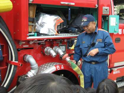 消防車の装備について、説明をうけました。いろんなところに収納するための扉があったり、上にも救命道具が収納されていたり、いろんな工夫がされています。ポンプを連結するための金具は、日本人が発明したということを教えてもらいました。