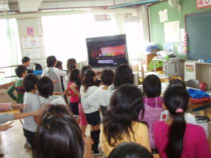 劇で踊る踊りを電子黒板で手本を見ながら練習しています。