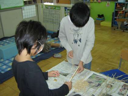 今日の朝、3組に遊びに来たお友達が稲の脱穀を手伝ってくれました。難しいな〜と、いっていましたがたくさん手伝ってくれました。