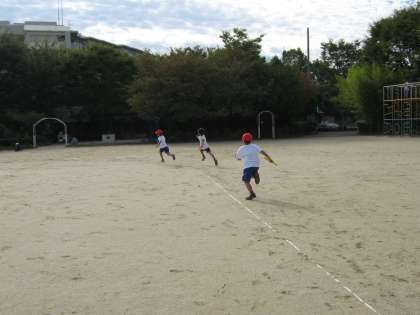 体育でリレーをしています。バトンをリードしながら受け取るのは難しいです。がんばれ!