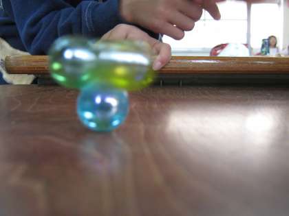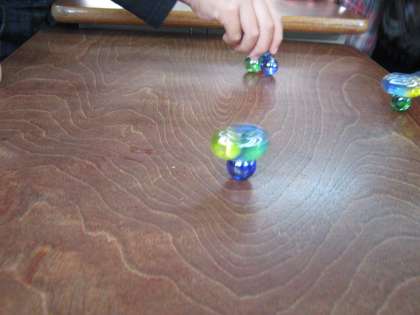 ビー玉でこまを作りました。いったいどんなふうにまわるのかな?とみんなでこま回しを楽しみました。