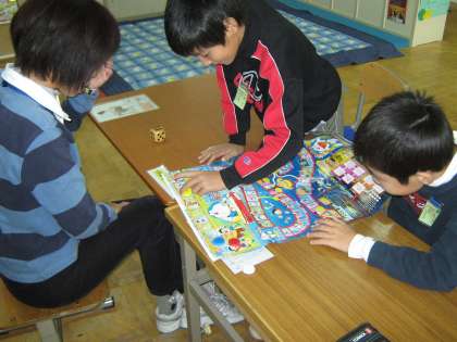 今日の昼休み、スゴロク遊びをみんなでしました。抜いたり、ぬかれたりとても面白かったです。