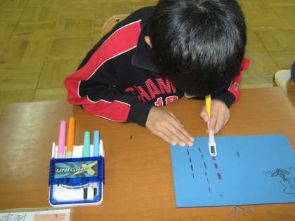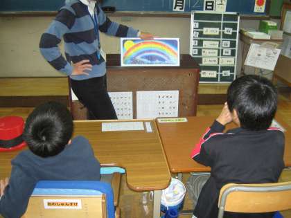 図工の学習で、版画に取り組みます。そこで、題材として絵本の「にじになった魚たち」を選びました。どんなお話か聞いたあと、下書きをしてのこりは彫刻刀で彫る練習をしました。