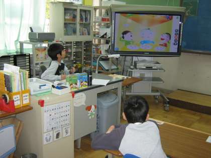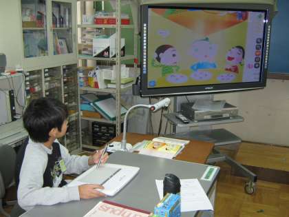 今日、算数の学習のとき自分の学習していることを、クラスのみんなに見てもらいました。実物投影機で教科書をうつして、ワイヤレスペンタブレットで説明を書き込みました。先生になった気分でした。