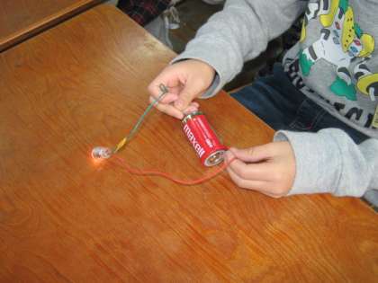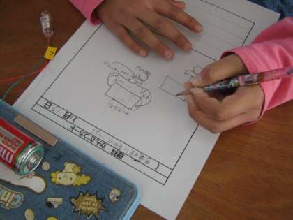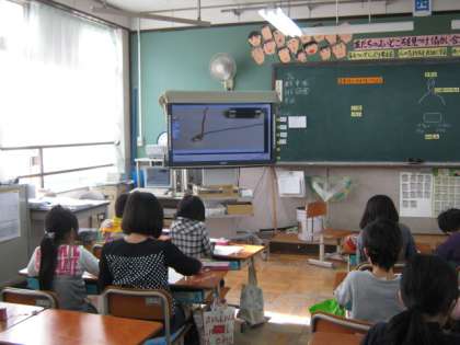 豆電球をソケットにいれてかん電池とどのようにつないだらあかりがつくか,調べました。その際,デジタルコンテンツをみんなで見てあかりがつくつなぎ方とつかないつなぎ方があることを確かめ,いろいろなつなぎ方をためしてみることができました。カードにもいろいろなつなぎ方を図でかくことができました。小さな豆電球でも,電子黒板で大きく見られるので,大変わかりやすいです。