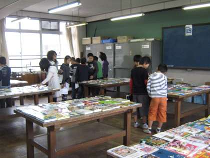 とてもおもしろそうな本がたくさん並んでいて,どれにしようか迷っているみんなでした。