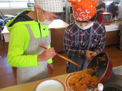 6年生は家庭科の学習で調理実習をしました。各班ごとに,「家族のために作る一食分の献立」を考えて作りました。できあがった料理を食べた子どもたちは,「おいしい!」「家でも今度作ろう。」と協力して作った料理の味に大満足。