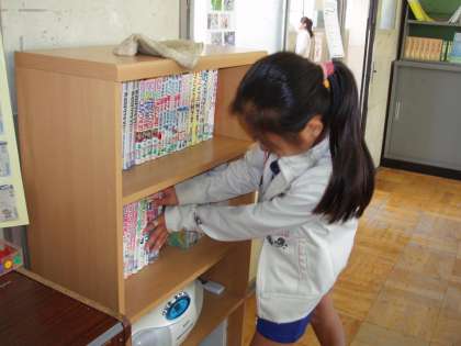 傘立ての汚れをとったり,机を拭いたり,本棚を整理したりしています。