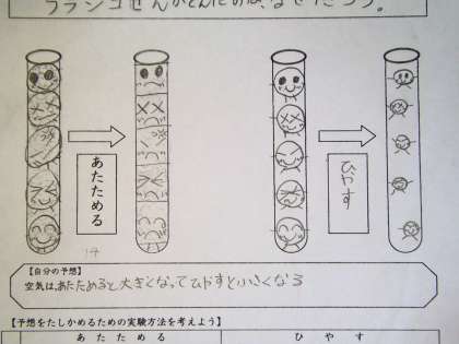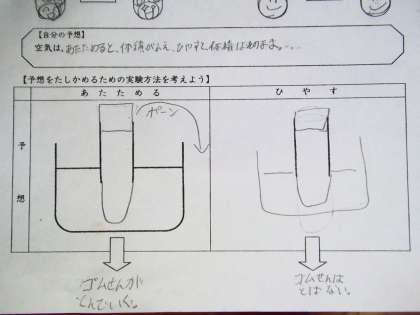 空気の体積はどのように変化するのか,予想を立てました。