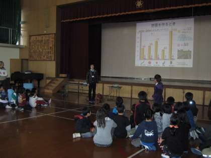 お話の途中に、エコクイズをしてくれました。全部で3問ありました。イチゴの旬は、春・夏・秋・冬のいつでしょう、という質問など、とてもおもしろかったです。