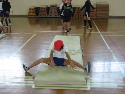 マラソンが終わったので、体育がマット運動になりました。開脚前転を頑張っています。