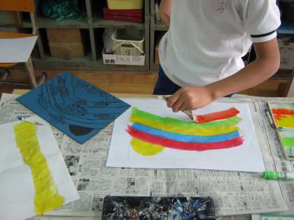 今日、図工の時間に版画の紙に色付けをしました。その紙の上に版画を刷ると、黒い版画のなかに7色の虹が浮かび上がります。