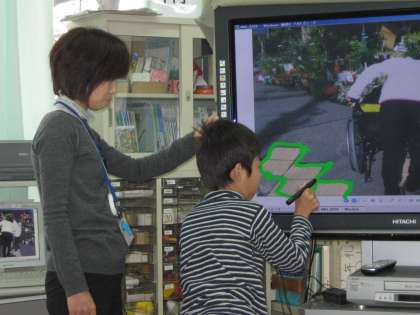 実際に、学校のまわりを調べてきて、撮ってきた映像を見てどんな工夫がされているか電子黒板に書き込んで発表しました。
